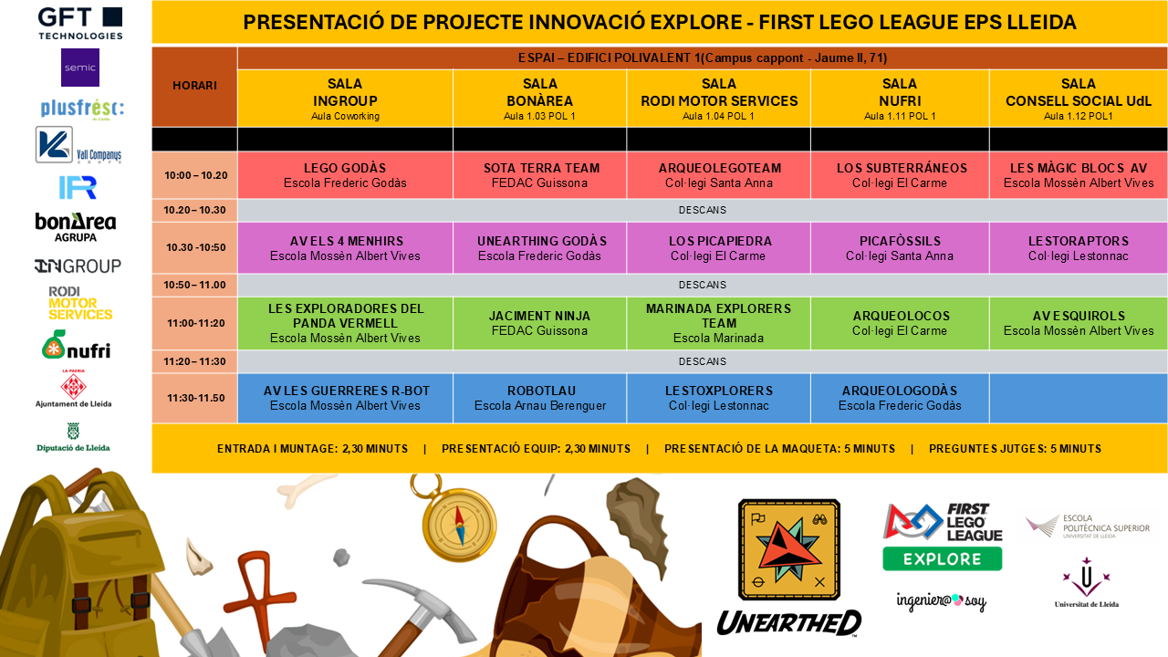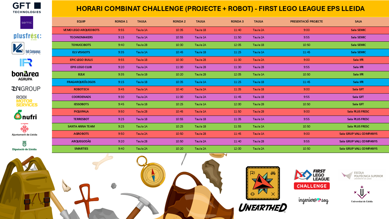 Descarregar Pdf Horaris Descarregar Pdf FLL Challenge FLL Explore FLL Challenge Presentació de Projectes Innovació Competició Joc de Robot Horari Combinat (Projecte Innovació + Rondes Robot) FLL Explore Horari Presentació de Projectes Darrera modificació: divendres, 20 de de febrer de 2026